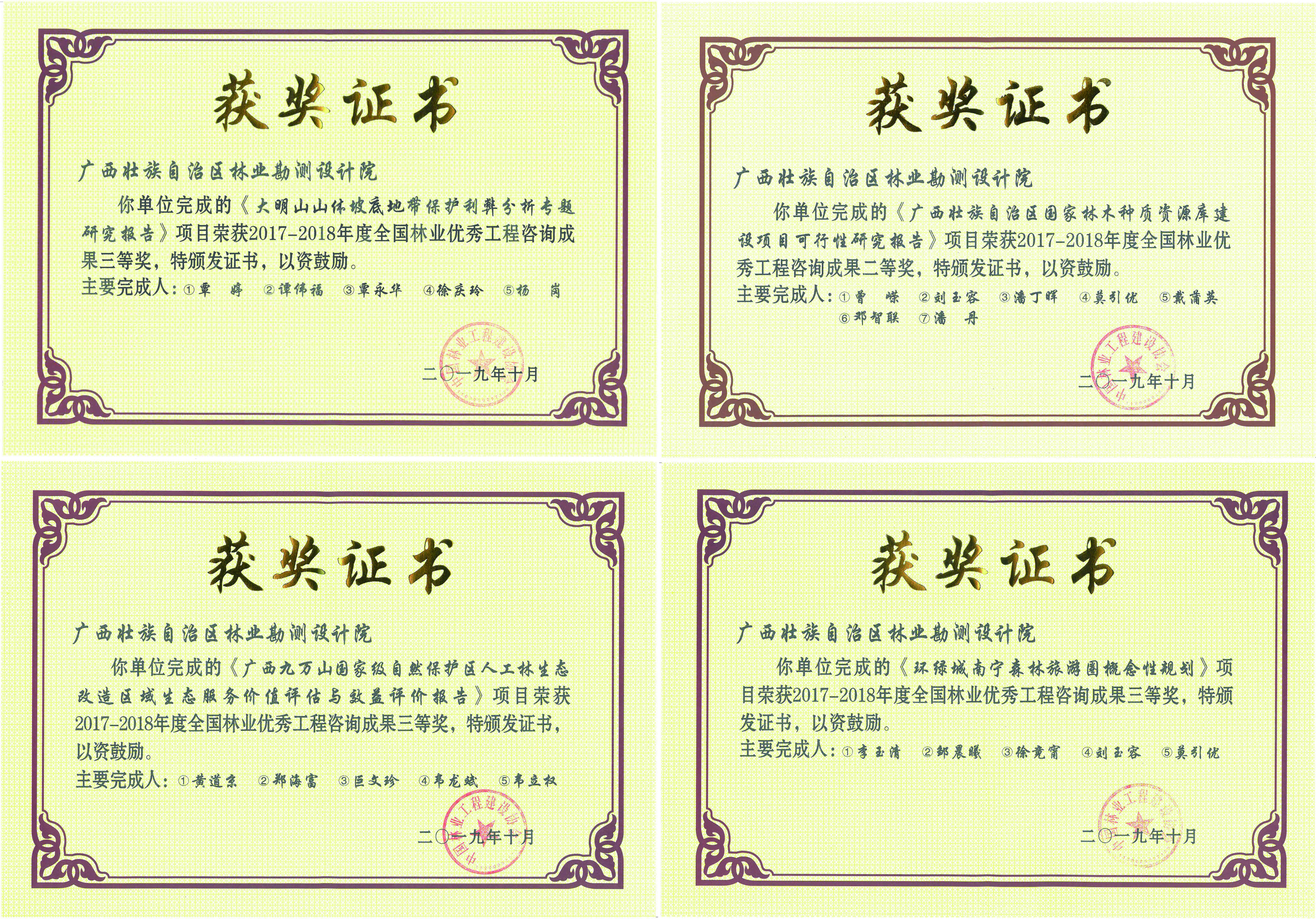 近日,我院组织申报的4项工程咨询成果项目获中国林业工程建设协会2017-2018年度全国林业优秀工程咨询成果奖。 其中,“广西壮族自治区国家林木种质资源库建设项目可行性研究报告”项目荣获全国林业优秀工程咨询成果二等奖;“大明山山体坡底地带保护利弊分析专题研究报告”“环绿城南宁森林旅游圈概念性规划”与“广西九万山国家级自然保护区人工林生态改造区域生态服务价值评估与效益评价报告”3项成果荣获全国林业优秀工程咨询成果三等奖。